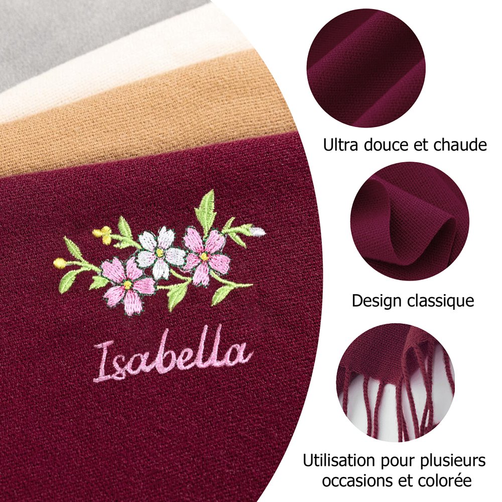 Cette écharpe est le cadeau idéal pour toute femme, qu'il s'agisse d'une amie, d'une sœur, d'une mère ou d'une petite amie. Qu'il s'agisse d'un anniversaire, de Noël, du jour de l'An, d'un anniversaire de mariage ou de la Journée de la femme, cette écharpe transmettra vos souhaits les plus sincères. Le motif floral symbolise la vitalité et la broderie personnalisée témoigne d'une attention personnelle. La destinataire se sentira chaleureuse et appréciera la prévenance de l'auteur du cadeau.