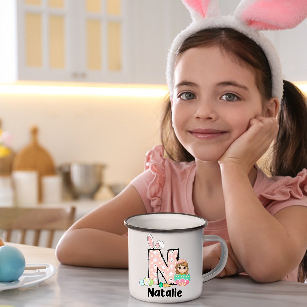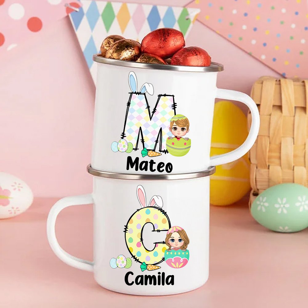 Cet adorable mug en émail présente un thème de Pâques ludique, avec des personnages de dessins animés cachés dans des œufs de Pâques colorés. Personnalisez-le avec le nom de votre enfant et l'initiale de ses mignonnes oreilles de lapin. Le design joyeux donne vie à la magie de Pâques, ce qui en fait un ajout amusant à toutes les célébrations de vacances.