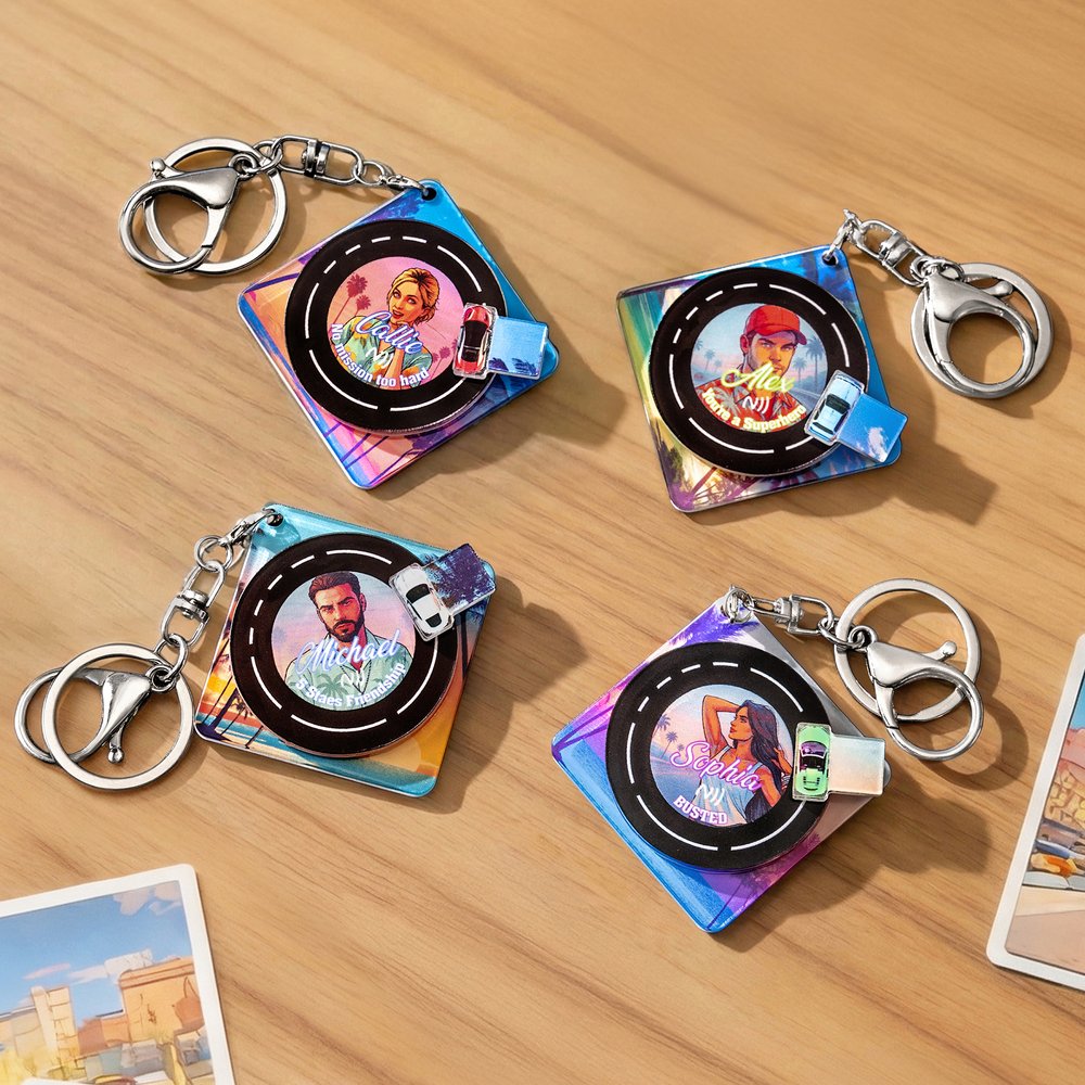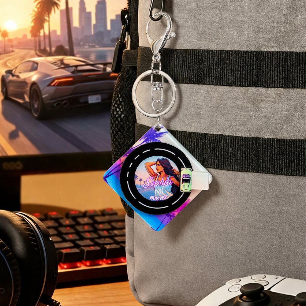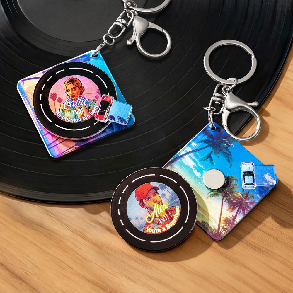 Ce porte-clés original présente un disque vinyle en rotation avec un stylet en forme de voiture, sur fond de néon-punk vibrant et de coucher de soleil tropical. Personnalisez-le avec un nom, un texte et un design de style portrait, puis ajoutez un lien vers votre chanson préférée pour un accessoire audacieux et unique en son genre.